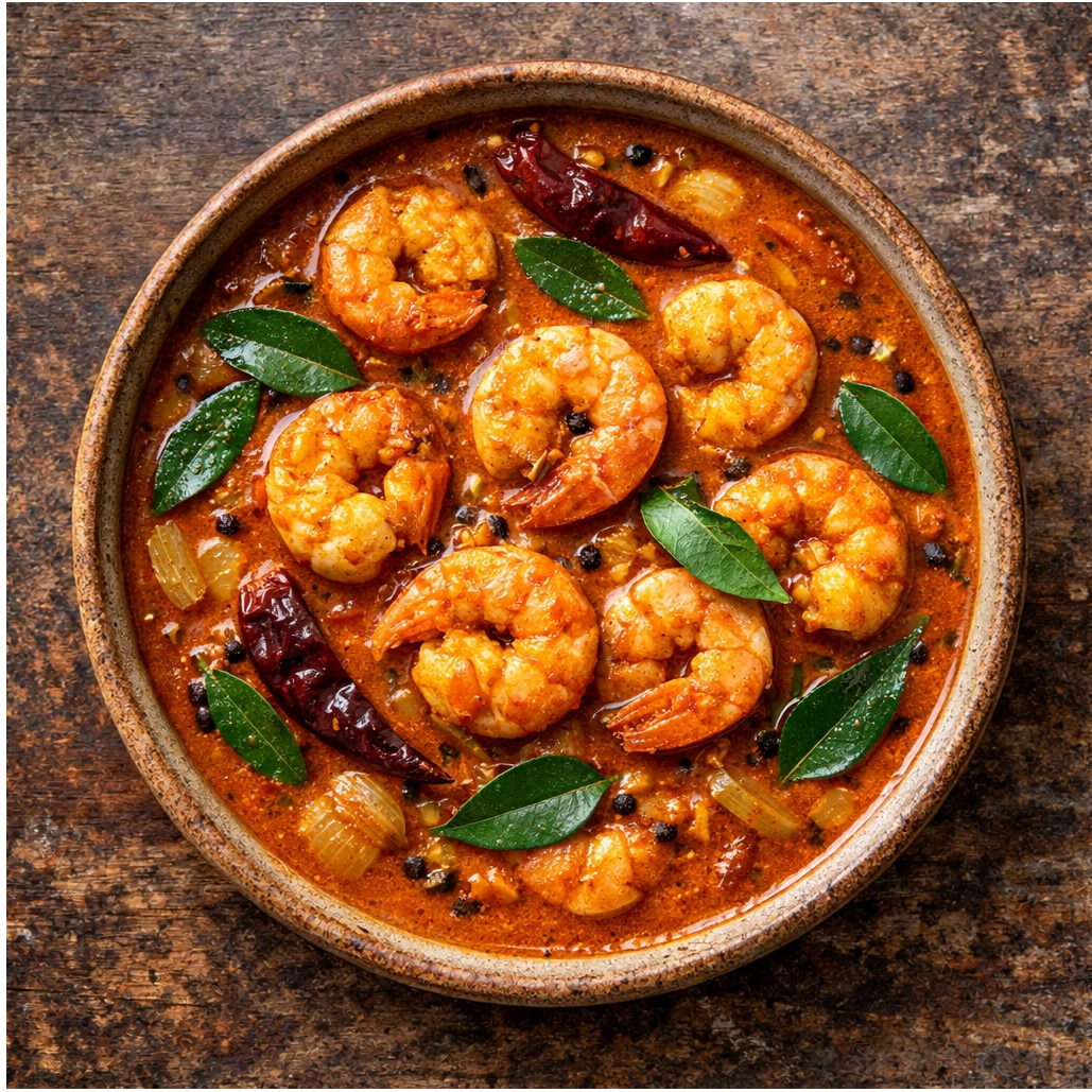 Prawns simmered in a rich, spiced coconut milk gravy, often flavored with raw mango.