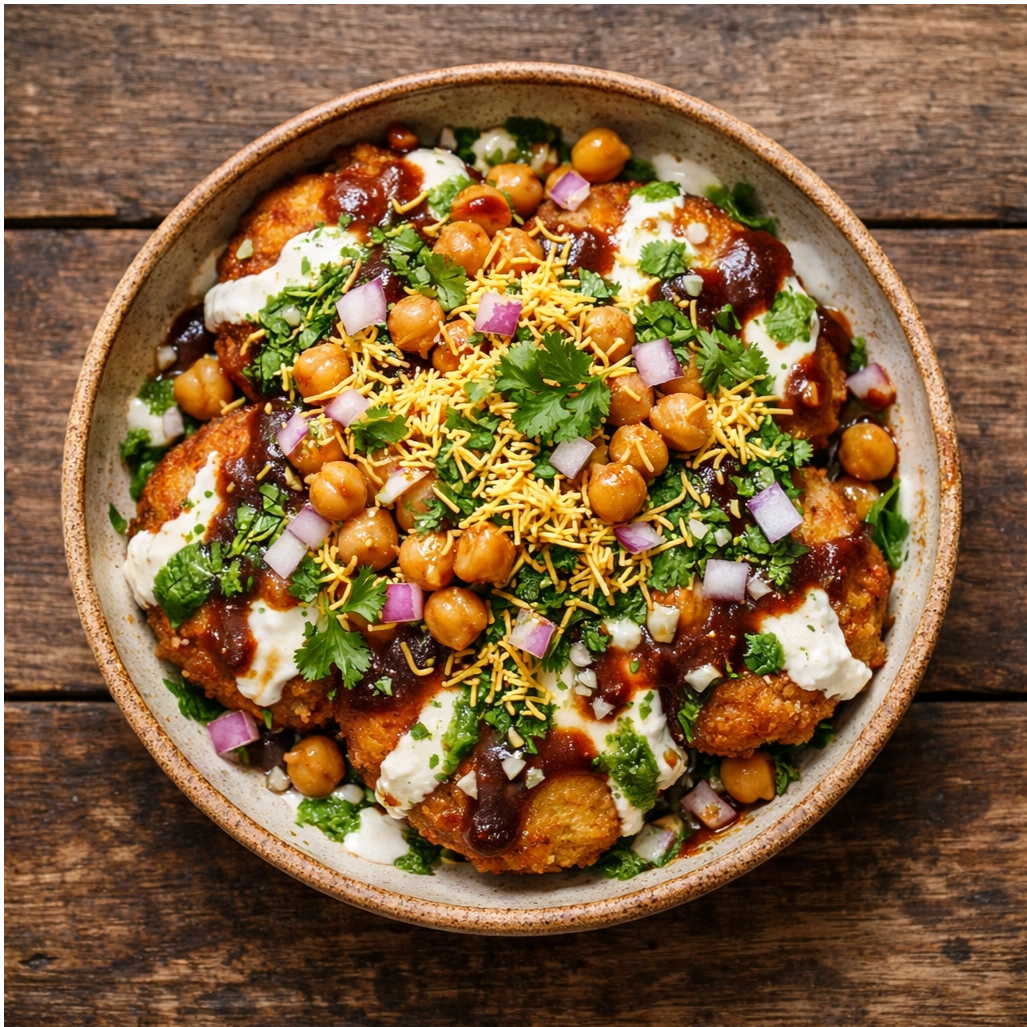 Crispy golden potato patties with tangy, sweet & spicy toppings
