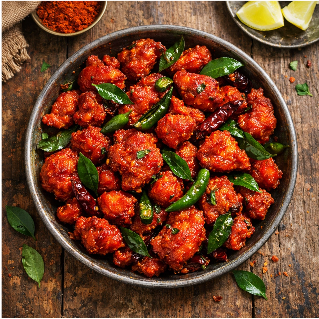 Deep-fried chicken marinated with yogurt, tossed with curry leaves and green chilies in a spicy tangy sauce.