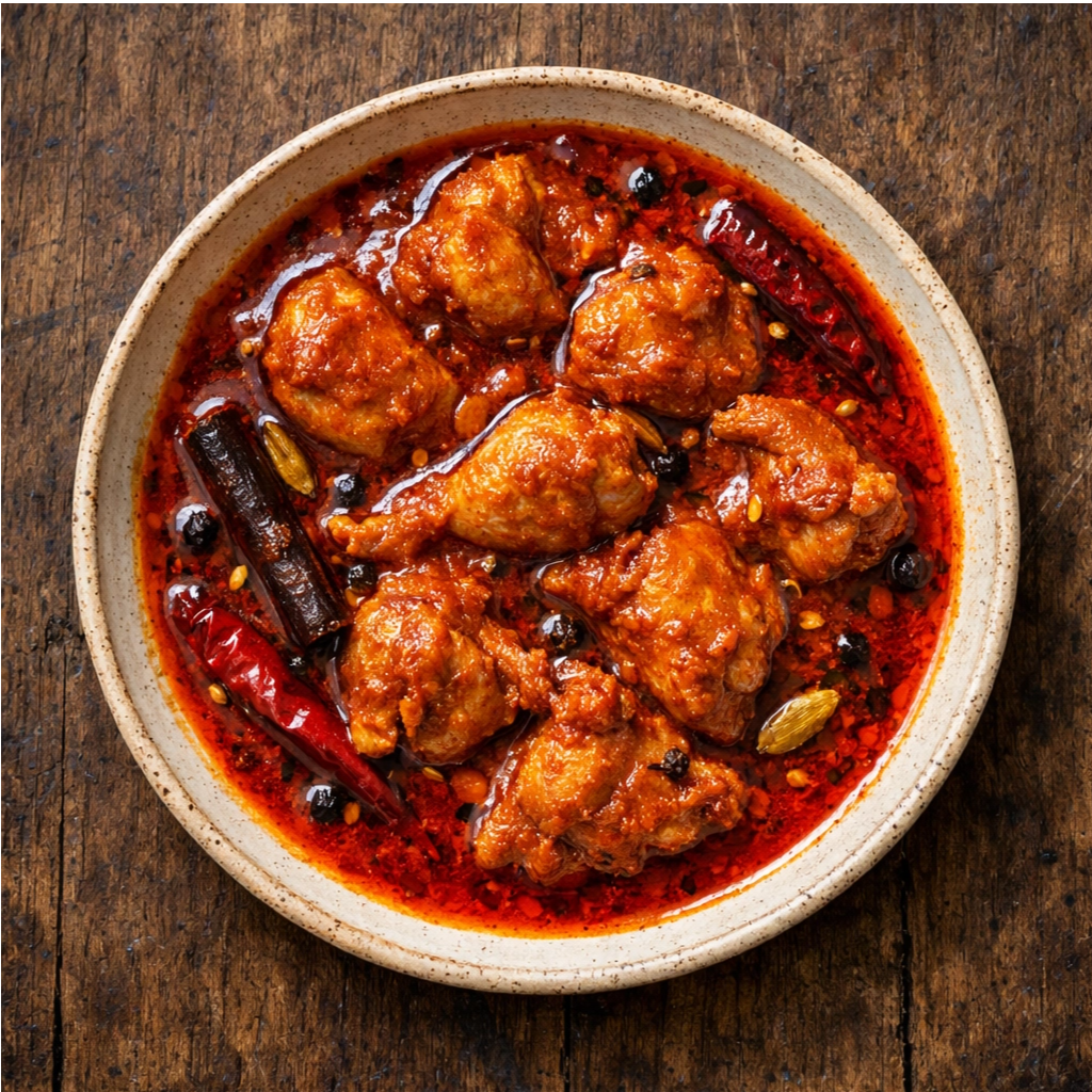 Spicy ginger, garlic, and vinegar concoction with smoked cloves and Kashmiri chili sauce.