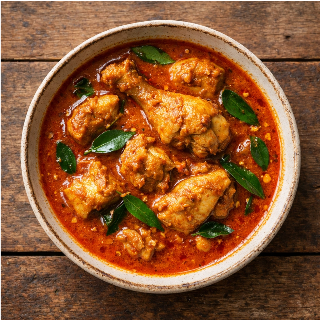 Chicken pieces simmered in a rich, savory sauce with whole spices, tomatoes, onions, and coconut milk. Must Try.