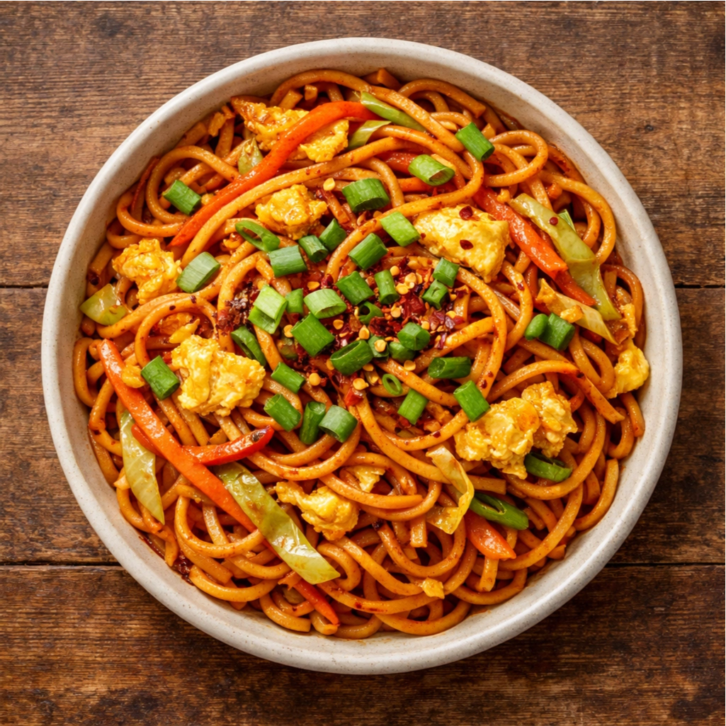 Spicy Schezwan noodles with egg