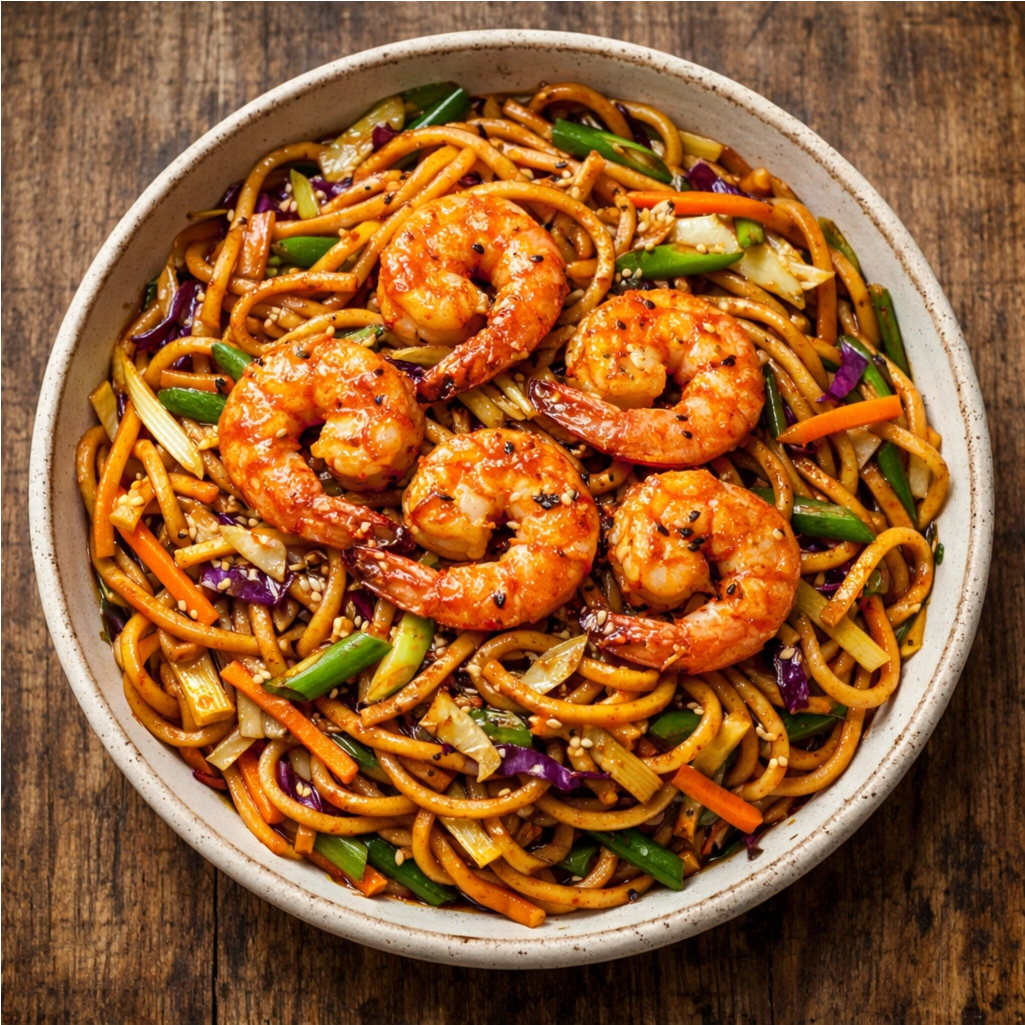 Spicy Schezwan noodles with shrimp
