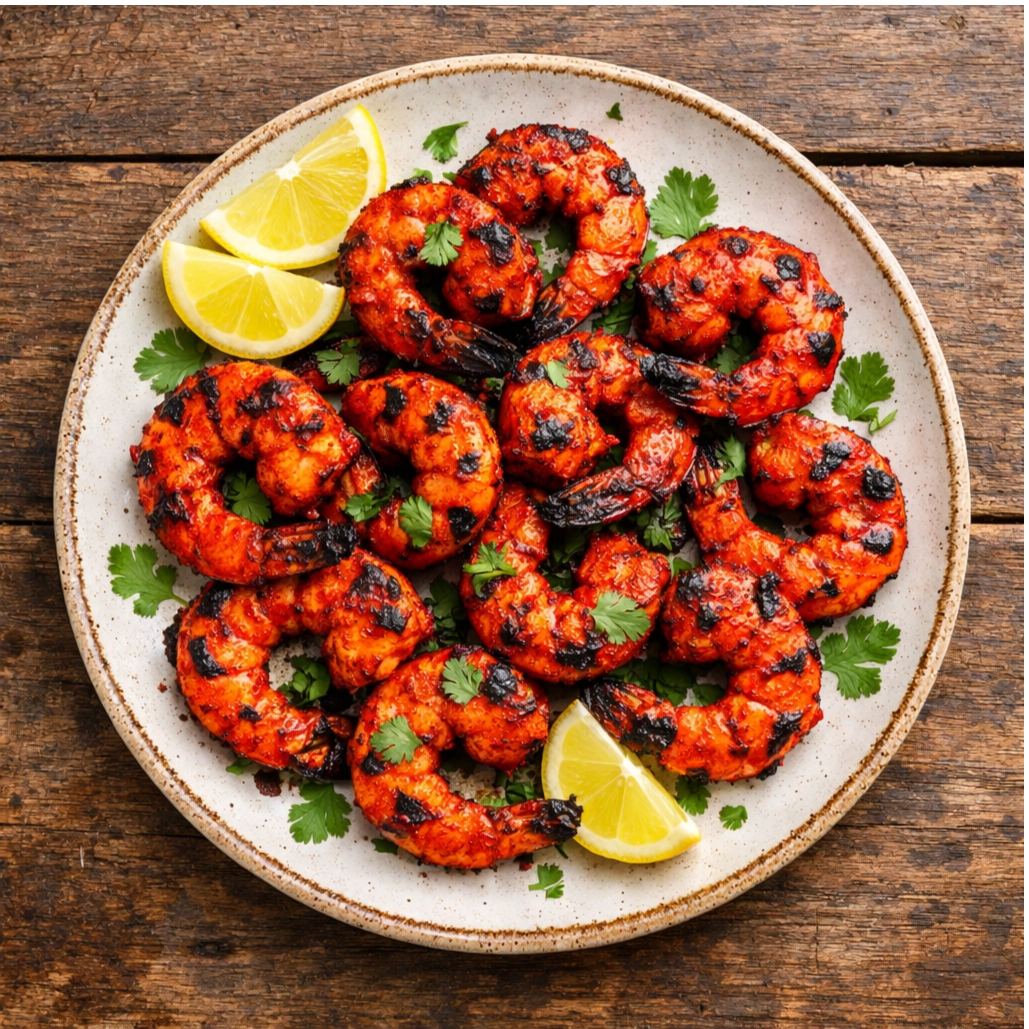 King prawns marinated in yogurt and a blend of flavorful spices, cooked in a clay oven.